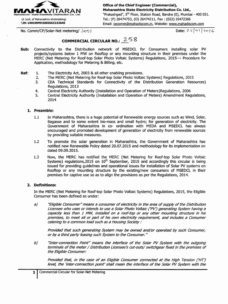 Connectivity to the distribution network of msedcl for consumers installing solar pv projects systems below 1 mw on rooftop or any mounting structure in their premises under the merc net metering for roof top solar photo voltaic systems regulations 2015 procedure for application methodology for metering billing.